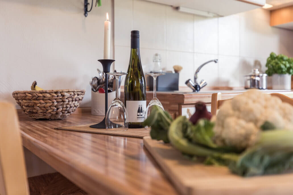Cerankochfeld, Umluftofen, Geschirrspüler, Wasserkocher, Mixer, Pürierstab, Toaster, Filterkaffeemaschine, Kühlschrank mit Gefrierfach, Sat TV mit Streaming, Bücher & Spiele, Bügeleisen, Fliegengitter vor den Fenstern.